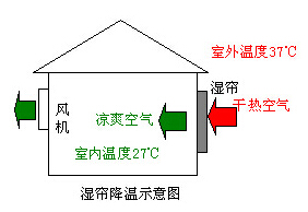 系统的降温过程是在其核心——湿帘纸内完成的。在波纹状的纤维纸表面有层薄的水膜,当室外的干热空气被风机抽吸穿过湿帘纸时,水膜中的水会吸收空气中的热量后蒸发,带走大量潜热,使经过湿帘纸的空气温度降低,经过这样处理后的凉爽湿润空气进入室内,与室内的热空气混合后,通过风机排出室外。